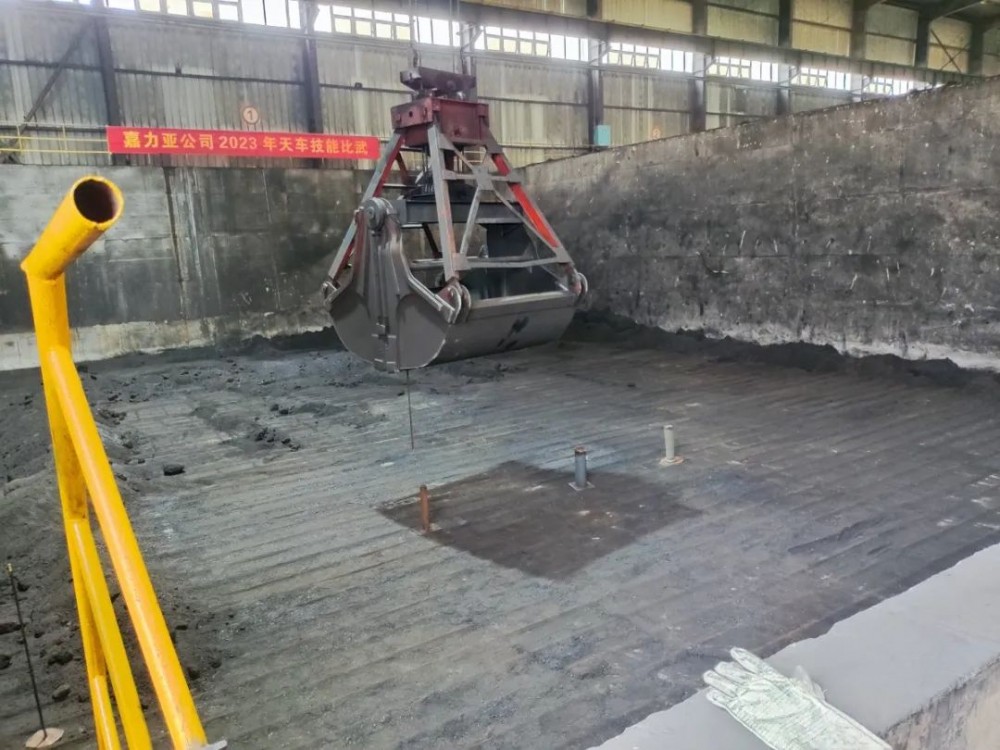 天车排块项目要求12分钟内使用单夹具将6块炭块排列整齐,排列完毕用大夹具能够正常夹取。看似简单的操作,实则不容易,考验是操作熟练程度、精准度,观察角度、摆放位置不一致都有可能导致大夹具不能够正常夹取,无法在规定时间内按要求完成任务。