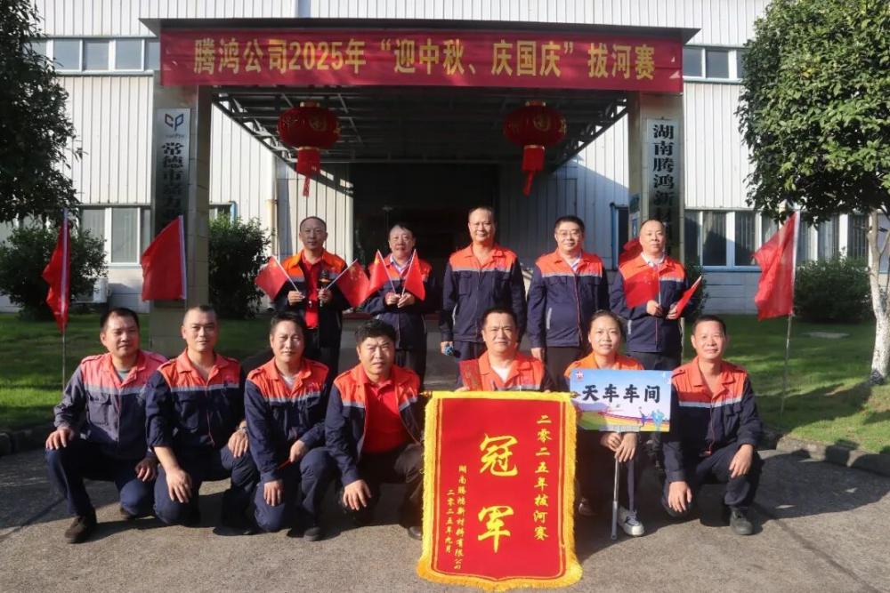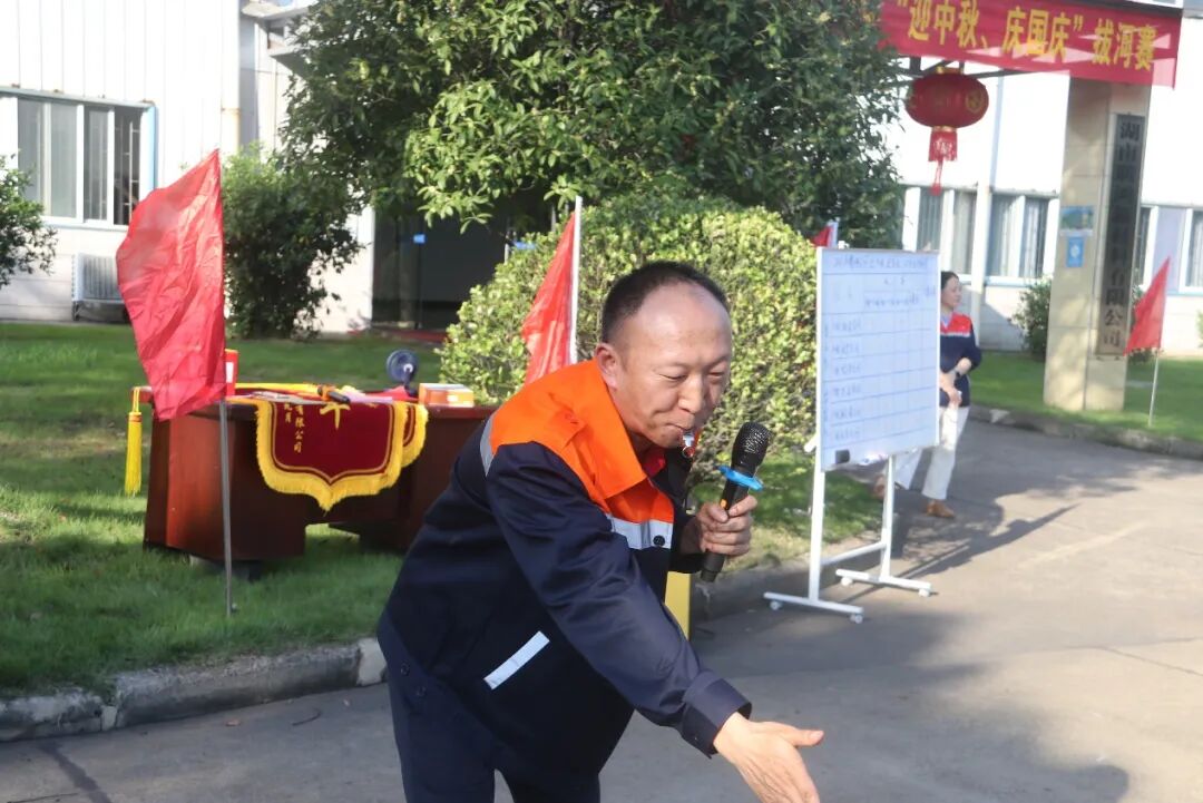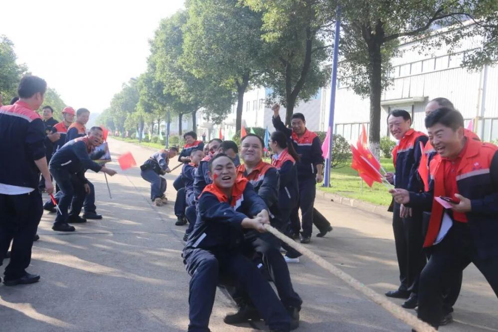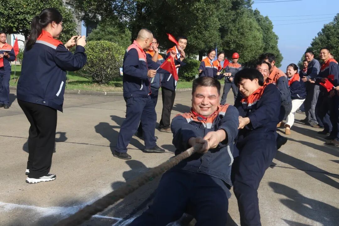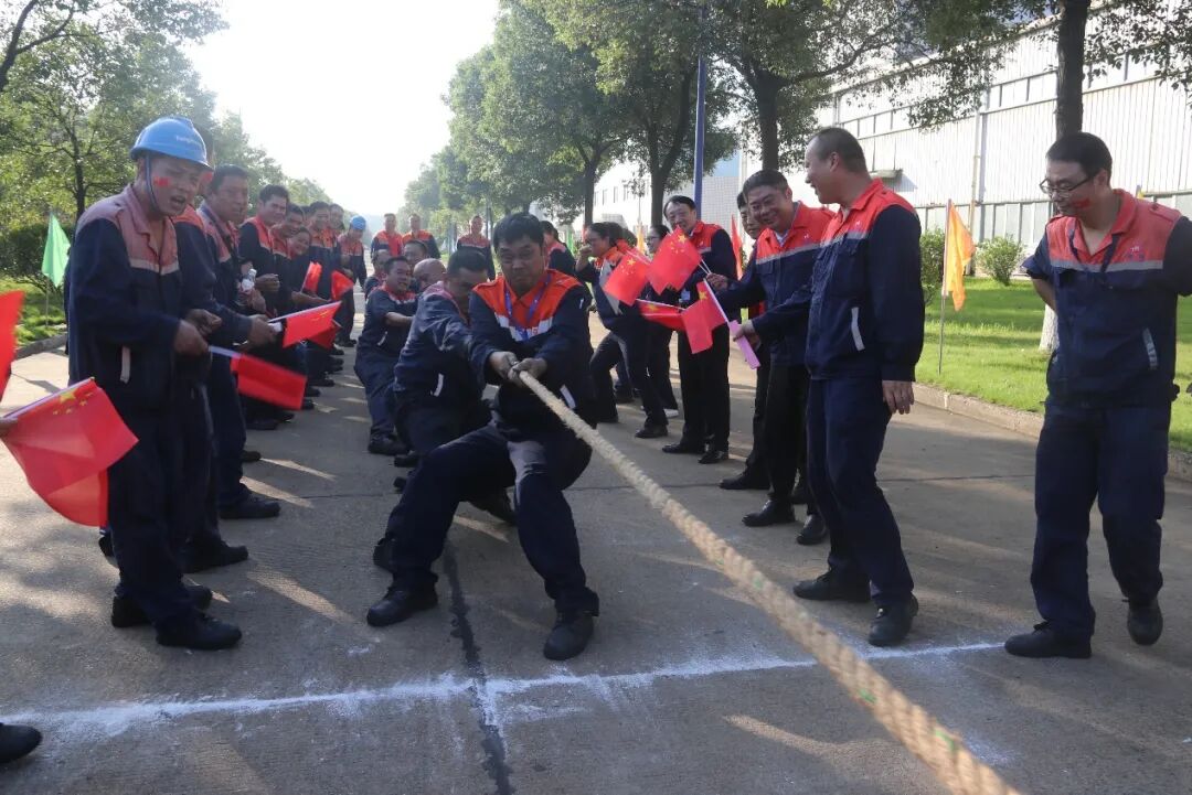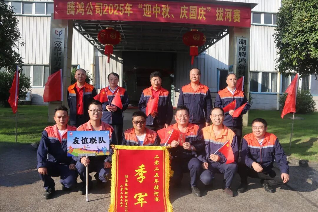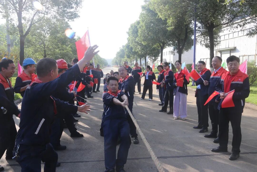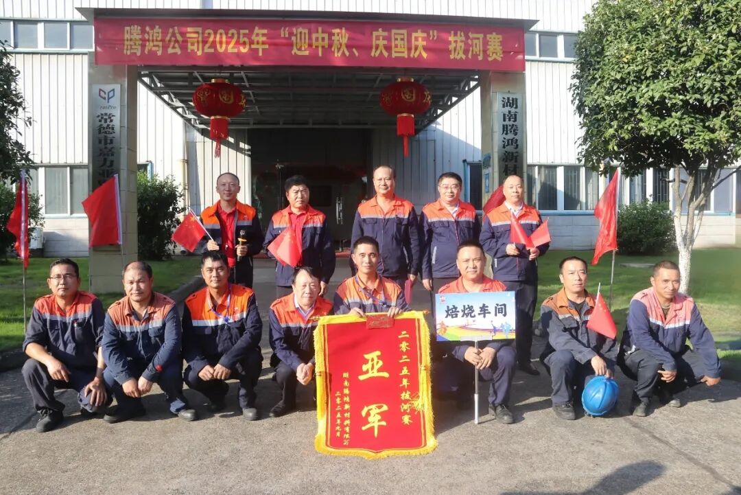 CHINA 国庆节 盛世华诞 举国同庆 副总经理高峰主持拔河赛 本次比赛有煅烧、成型、焙烧、天车、检修、综合+余热车间等六支队伍参加,行管部门与结对车间组合,每支队伍8人参赛,其中至少1名女员工。比赛以竞技之名搭协作之桥,旨在打破部门壁垒,增进相互沟通信任,强化“劲往一处使,心往一处聚”的团队精神,全面提升团队向心力、战斗力。赛场上,麻绳紧绷如弦,呐喊声震耳欲聋。各参赛队员肩并肩、脚抵脚,紧握绳索全力拼搏,场边啦啦队助威声浪此起彼伏,将比赛氛围一次次推向高潮。 主裁判风姿 副裁判风姿 煅烧车间赛场风姿 成型车间赛场风姿 焙烧车间赛场风姿 检修车间赛场风姿 天车车间赛场风姿 综合+余热车间联队赛场风姿 冠军队——天车车间 亚军队——焙烧车间 季军队——综合+余热车间联队 公司党支部书记、工会主席龚健喜作总结讲话 赛后,公司党支部书记、工会主席龚健喜讲话。他说,拔河比赛,比的是荣誉感,赛的是精神。比赛有胜负,精神无高低,每个队员都展示了强烈的集体荣誉感,都有夺取胜利的渴望,大家在赛场上全力以赴、顽强拼搏,充分展现了“不服输、敢争先”的团队精神,无论哪支队伍获胜,都是腾鸿的骄傲,希望大家胜不骄、败不馁,把赛场上的斗志转化为生产中的动力。拔河比赛,比的是凝聚力,赛的是激情。一根绳、一条心,当队员紧握绳索、脚踏实地、全力拼搏时,有人齐声呐喊,有人咬牙坚持,不抛弃、不放弃,深刻体现了心往一处想、劲往一处使的凝聚力。工作中,我们同样需要这种力量——面对艰巨任务,不推诿、不抱怨;遇到技术难题,敢突破、敢攻坚。今天的赛场,就是明天生产攻坚的战场,让我们把赛场上的激情,带回车间、带回班组、带回岗位。拔河比赛,比的是爆发力,赛的是健康。拔河是体力的较量,更是健康的比拼,看谁稳得住、看谁耐力强、看谁配合好,希望大家把赛场上的拼劲,也用在日常生活中,练就健康体魄,创造美好生活。目前,新煅烧、三焙技改项目基本完工投运,公司综合实力、市场竞争力再上新台阶;下一步,生活区建设也将紧锣密鼓地展开。腾鸿为我们提供了更大的舞台,让我们与腾鸿一道共同努力、不断向前,推动腾鸿发展更红火、大家生活更幸福!